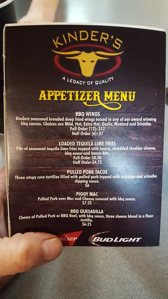 Complement your meal with our sides, featuring Tequila Lime Fries and scrumptious Cheesy Bacon Fries. Every dish is crafted with quality ingredients and a passion for BBQ excellence. Visit us today and savor the Kinder’s experience!
